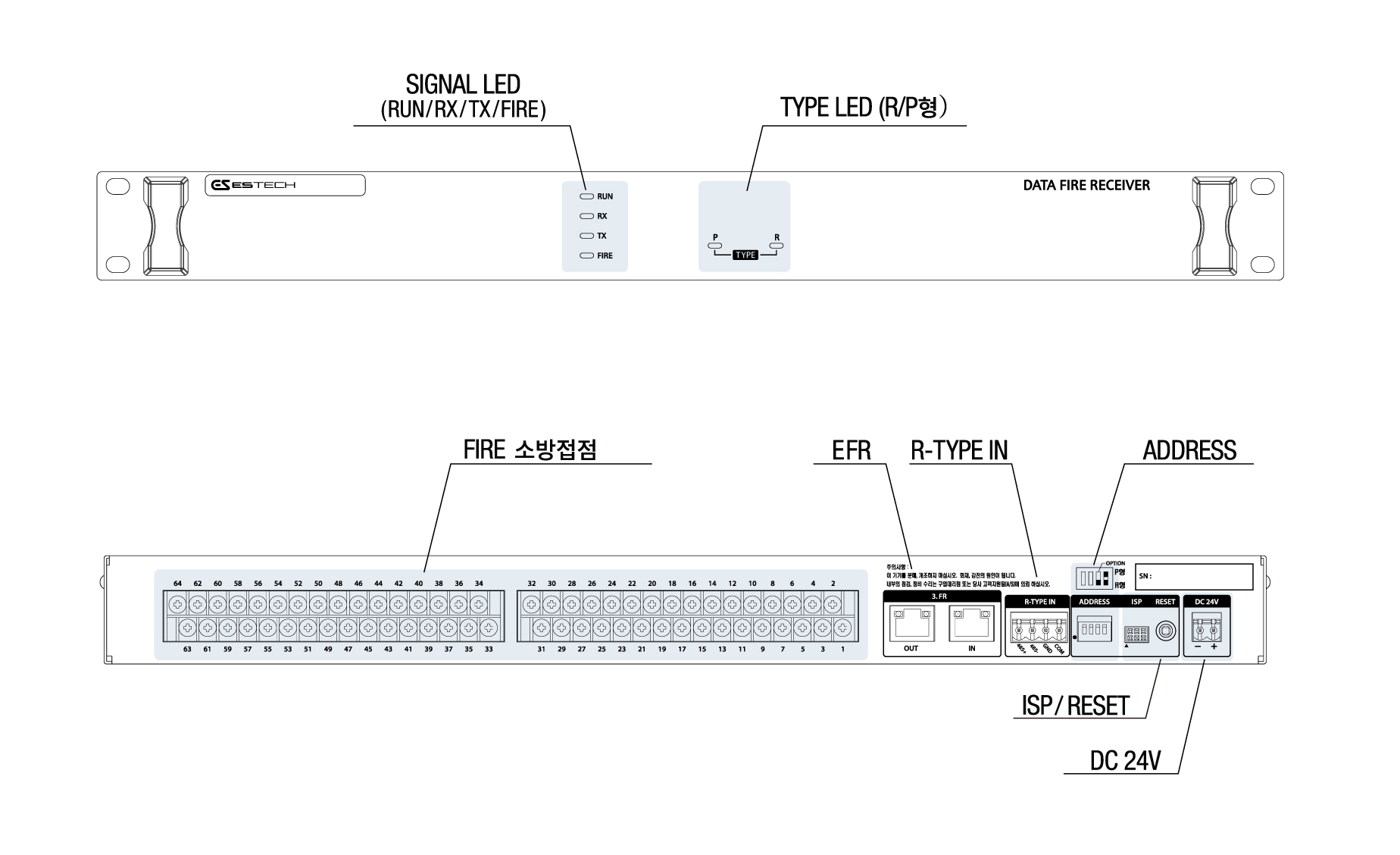 화재 발생 시 화재 신호를 분석하여 전관방송시스템의 메인 컨트롤러 장비에 DATA 통신 방식으로 신호를 전달하는 장비입니다.